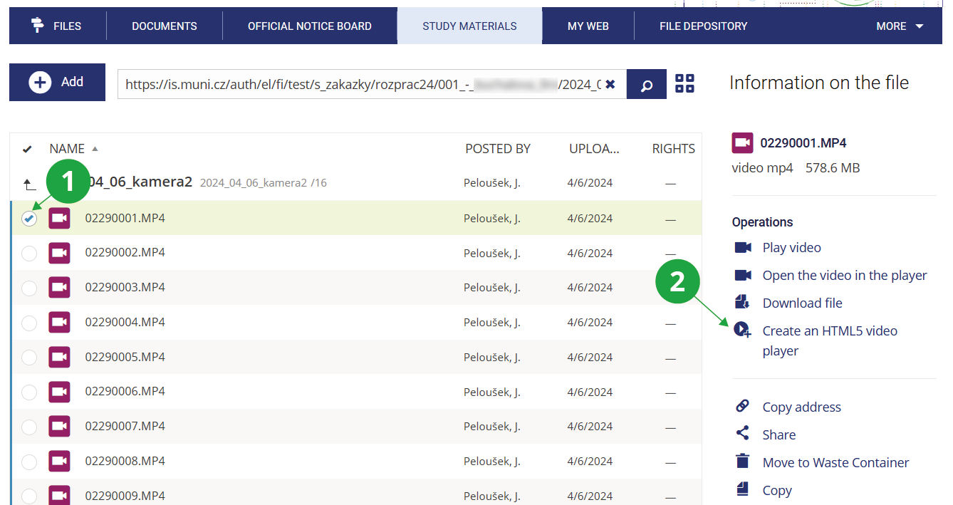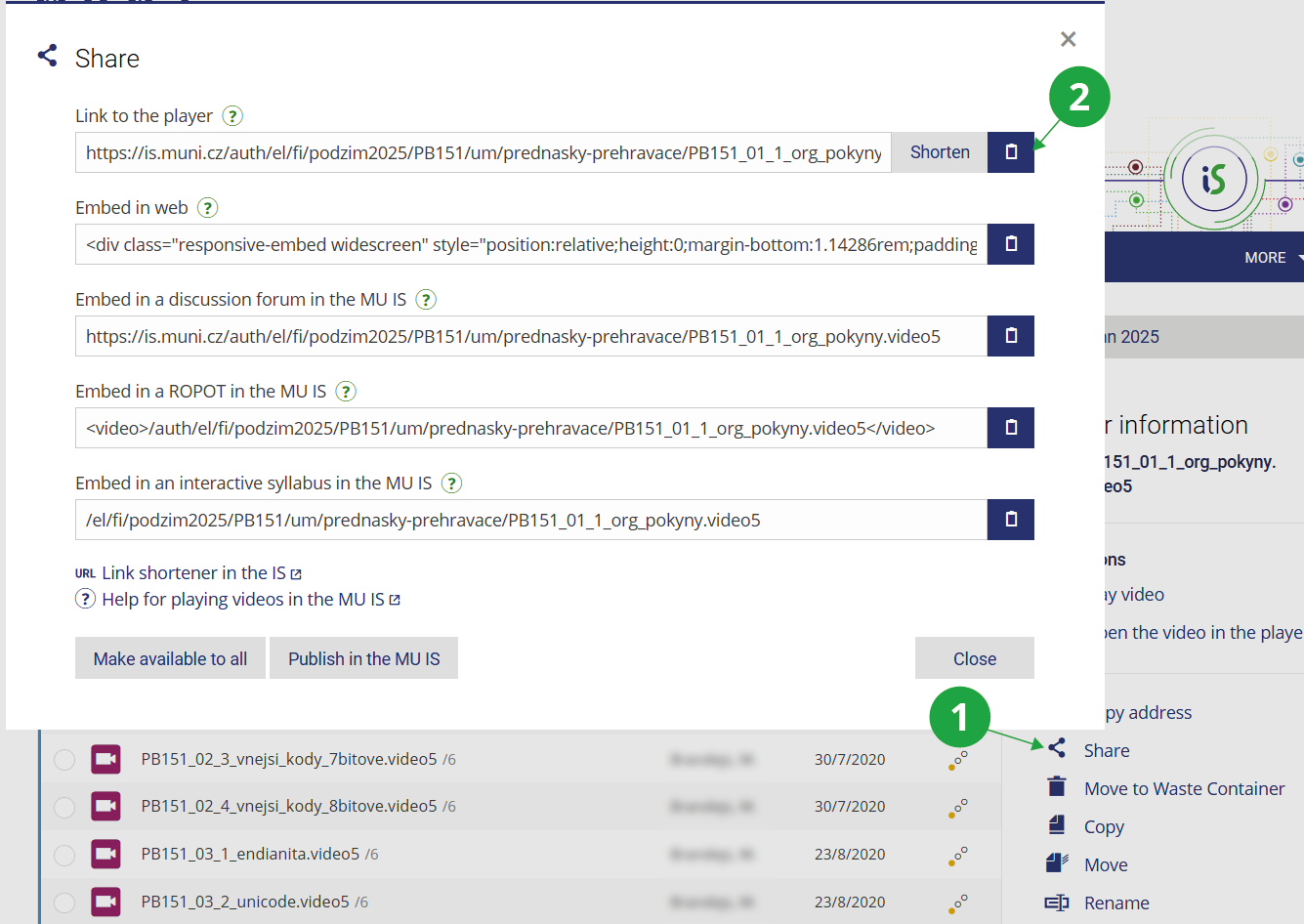 - 10.Inserting a video into custom materials (for example a study website)You can generally insert a video anywhere that allows embedding HTML code. Use the option “Video embed code” available in the video sharing section. Do not forget to correctly set access rights and choose the appropriate embed code (authenticated or non-authenticated).