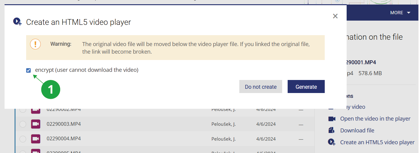 In the File Manager, click on the row containing the video file and select the “Create an HTML5 video player” option from the displayed menu.